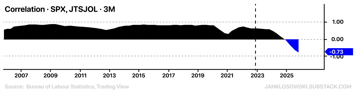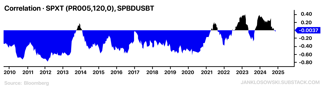 It’s a lagging indicator, but that’s precisely why it matters. Shorter timeframes show noise; this shows how unusual sustained negative correlation is.