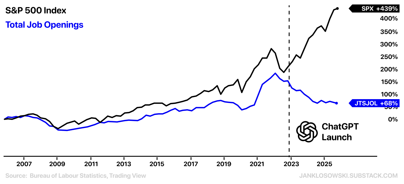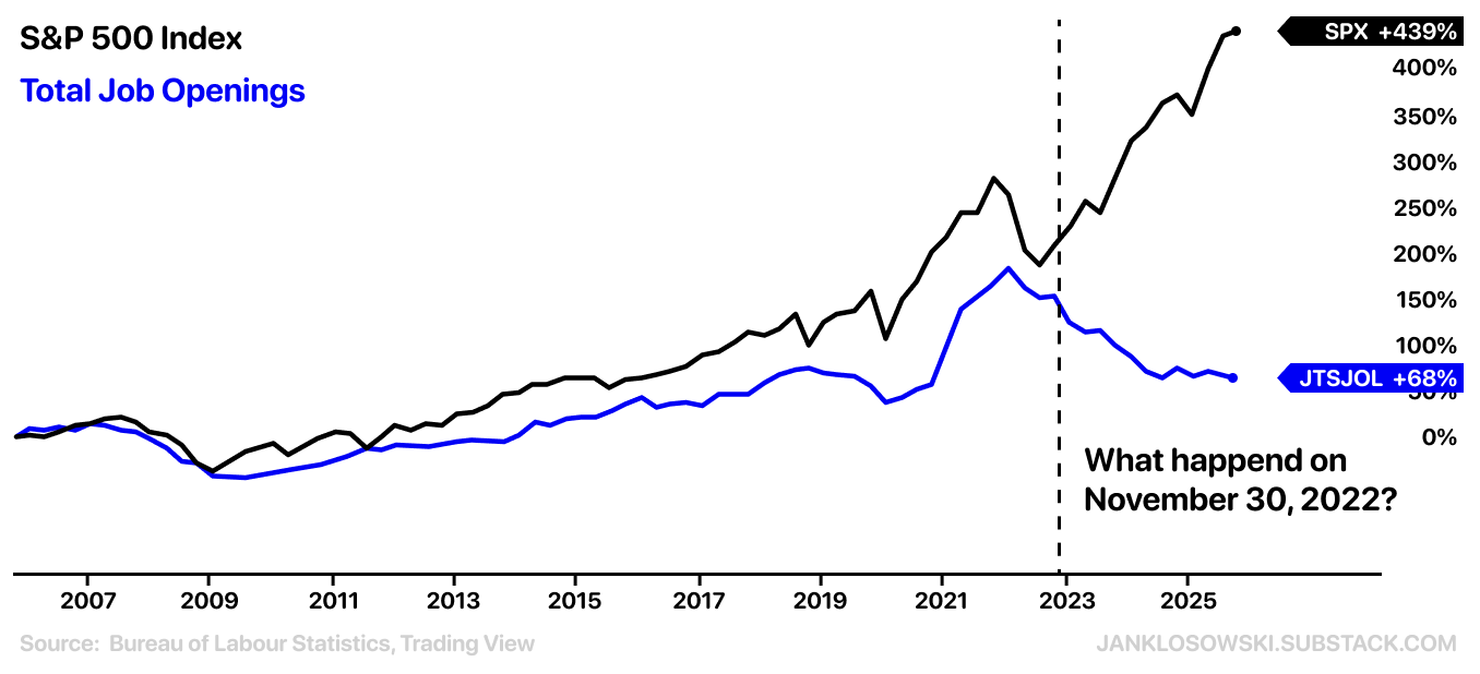 Something happened on November 30, 2022. Since then, some of the Magnificent 7 stocks have almost tripled. Meanwhile, job openings are back to the 2019 levels.