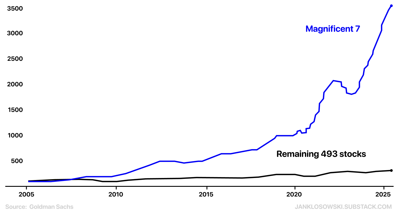 The S&P 500 isn’t what you think it is. The “500” implies diversification, but the Magnificent Seven (Apple, Microsoft, Google, Amazon, Nvidia, Meta, Tesla) now represent over 35% of the entire index. In 2023, these seven stocks generated nearly all the gains. The other 493 companies? Barely keeping pace with inflation. The S&P 500 is no longer diversification—it’s 7 companies dragging 493 along. If you own VOO, you’re paying for dead weight.